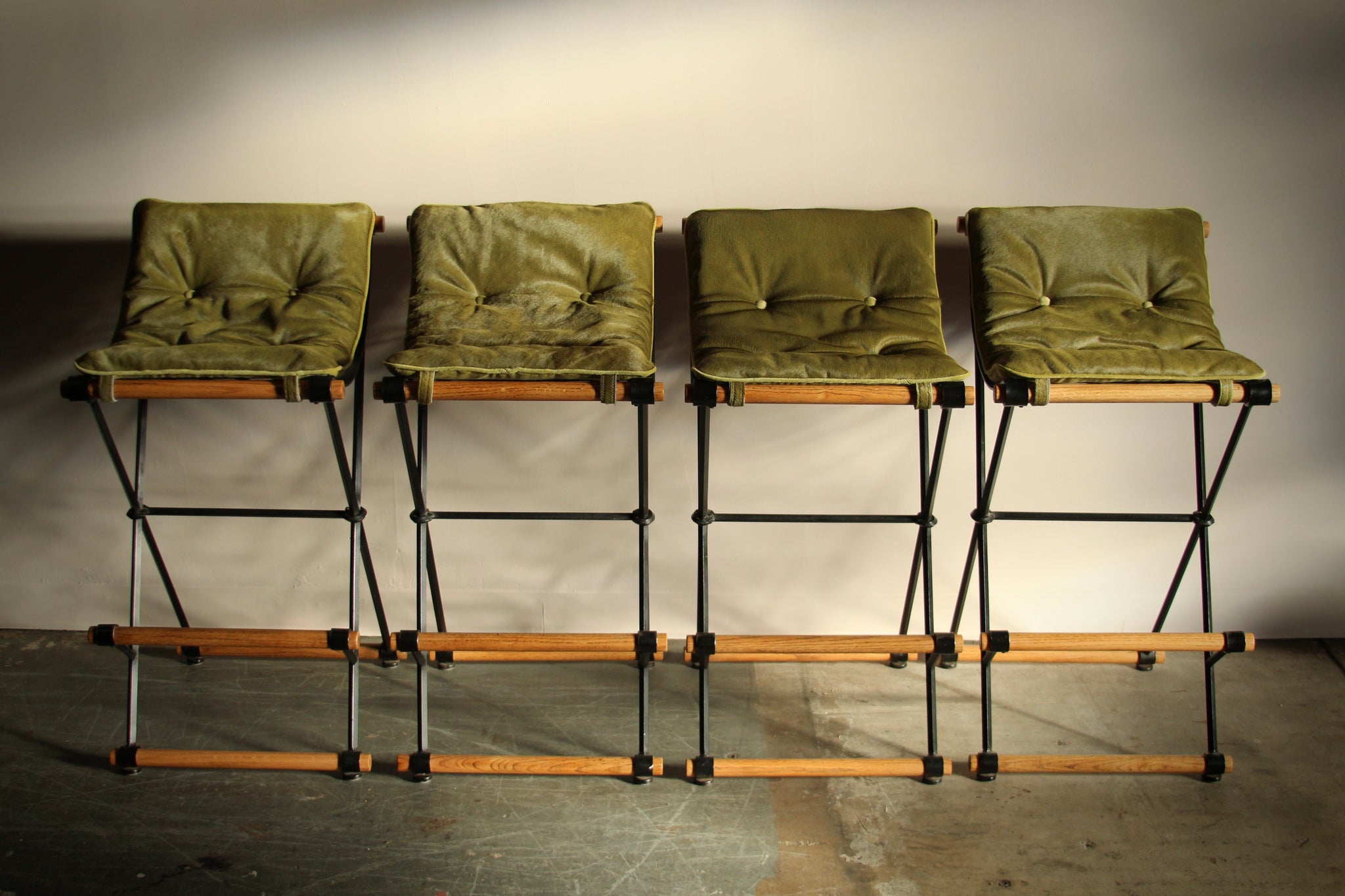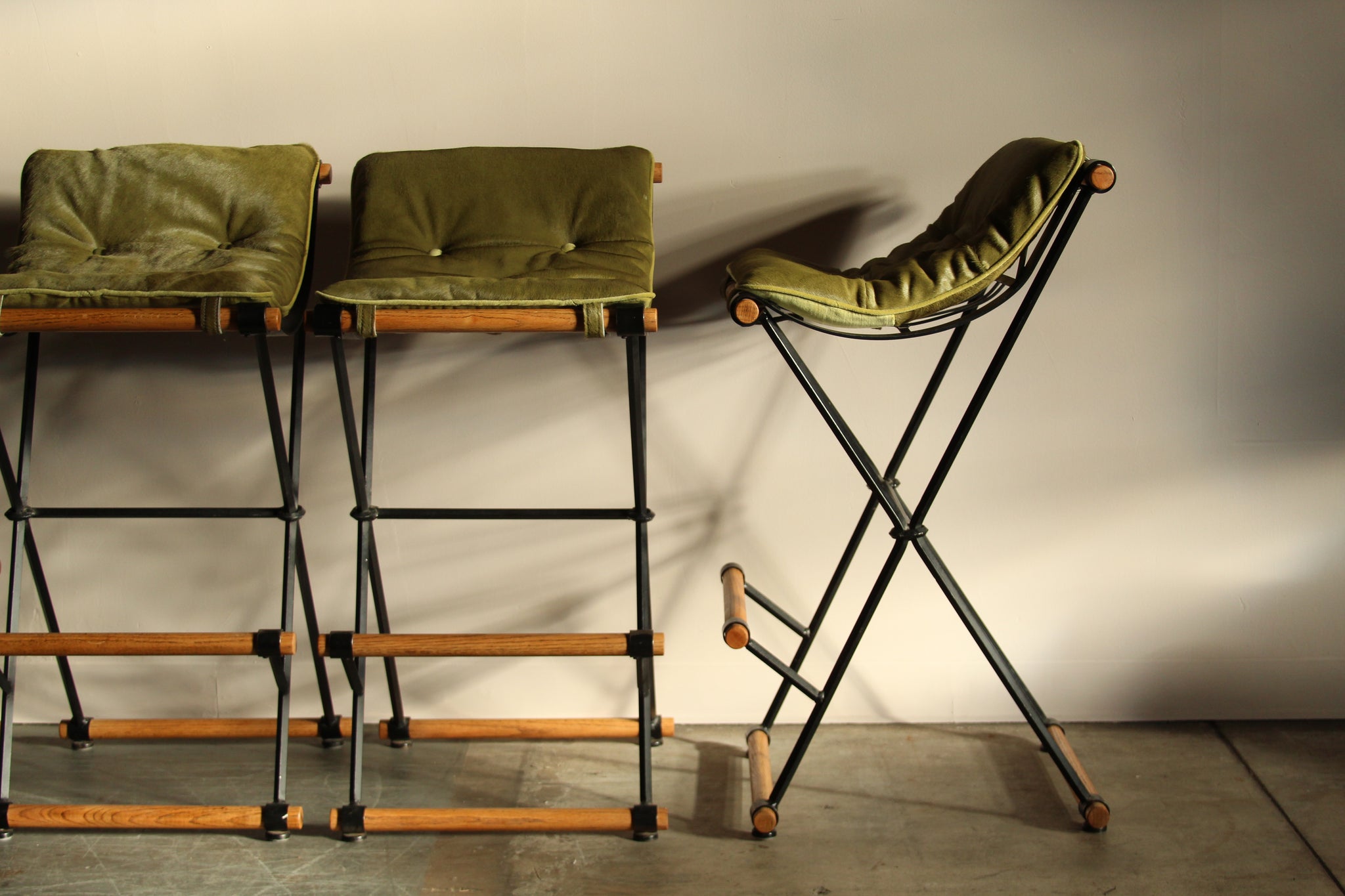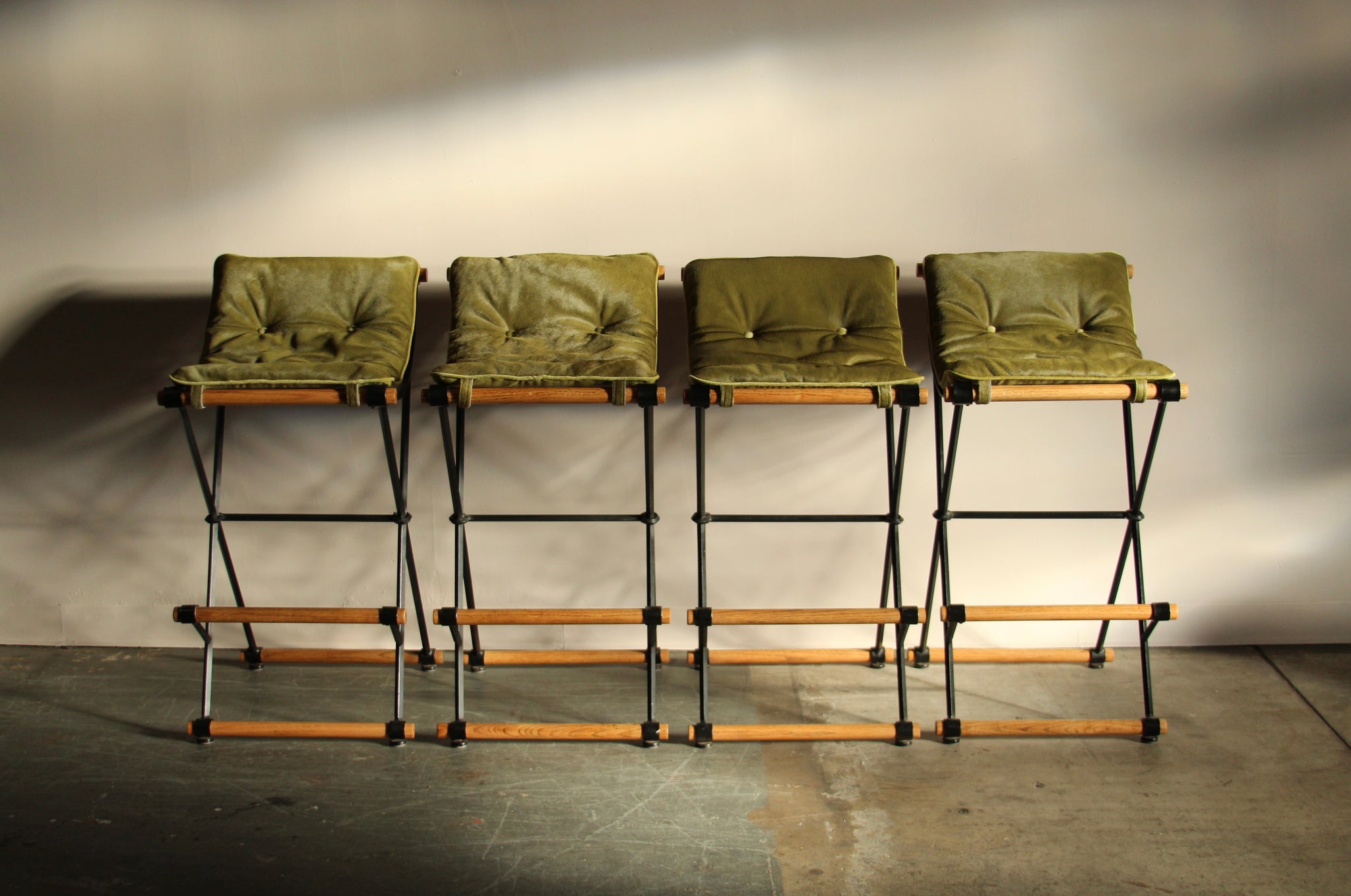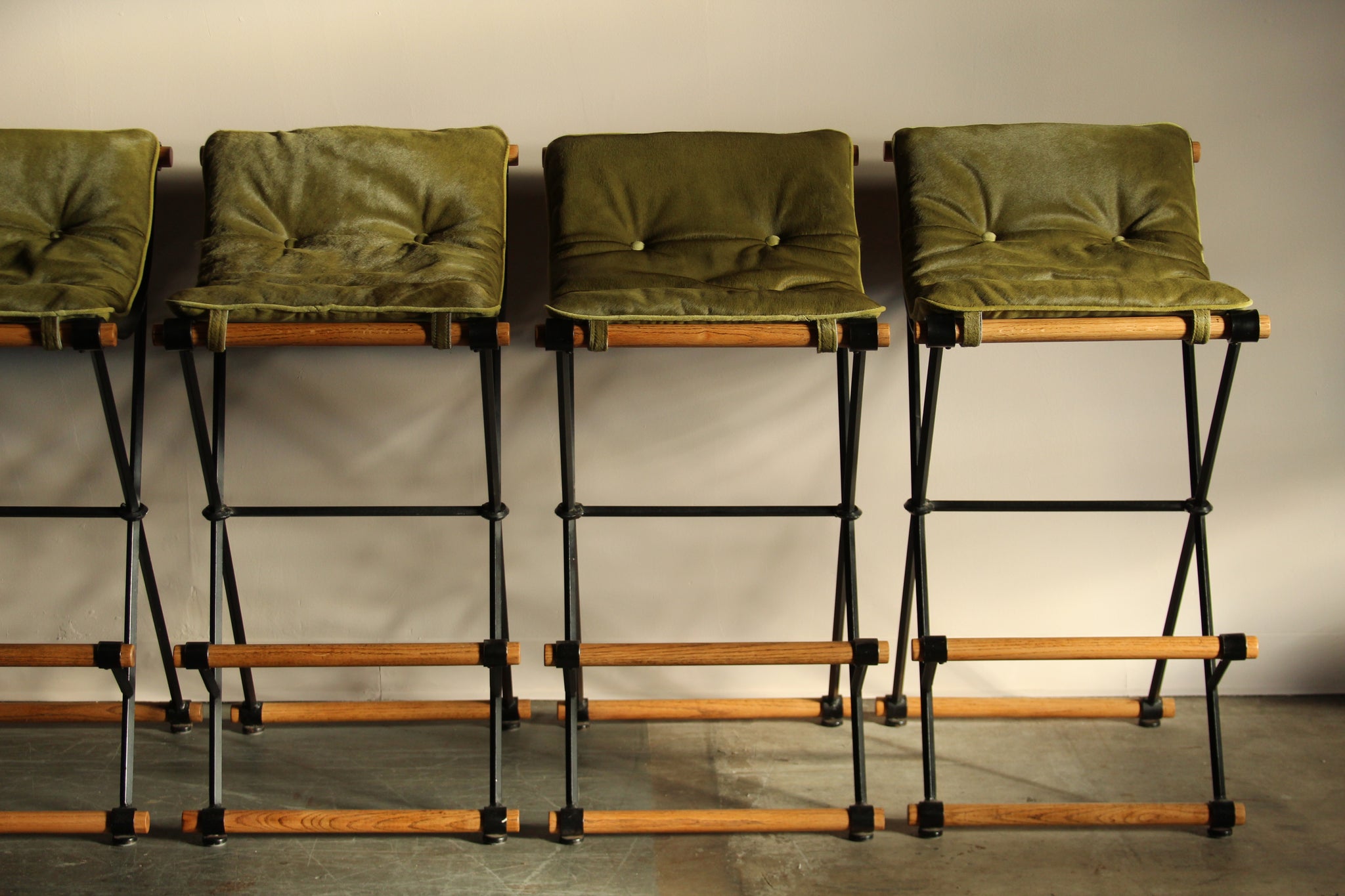 A sublime set of four California modernist barstools designed after Cleo Baldon, and manufactured in the 1960s. The unique, heavy duty stools feature wrought iron construction with solid oak elements and footrest. They have undergone a full restoration: all wood elements have been beautifully refinished, and the cushions have been reimagined in a stunning moss green cowhide with green velvet piping and buttons. The texture of the hide contrasts beautifully against the more industrial materials of the stool.
