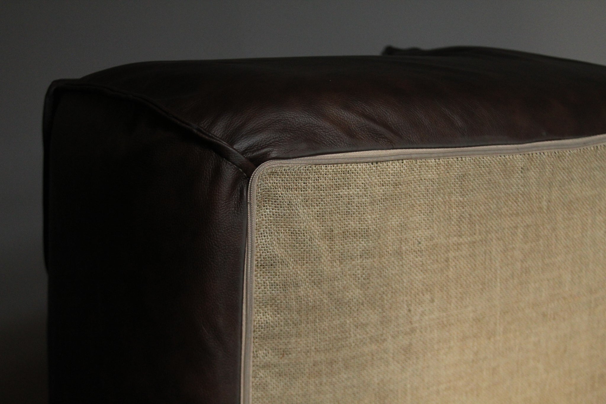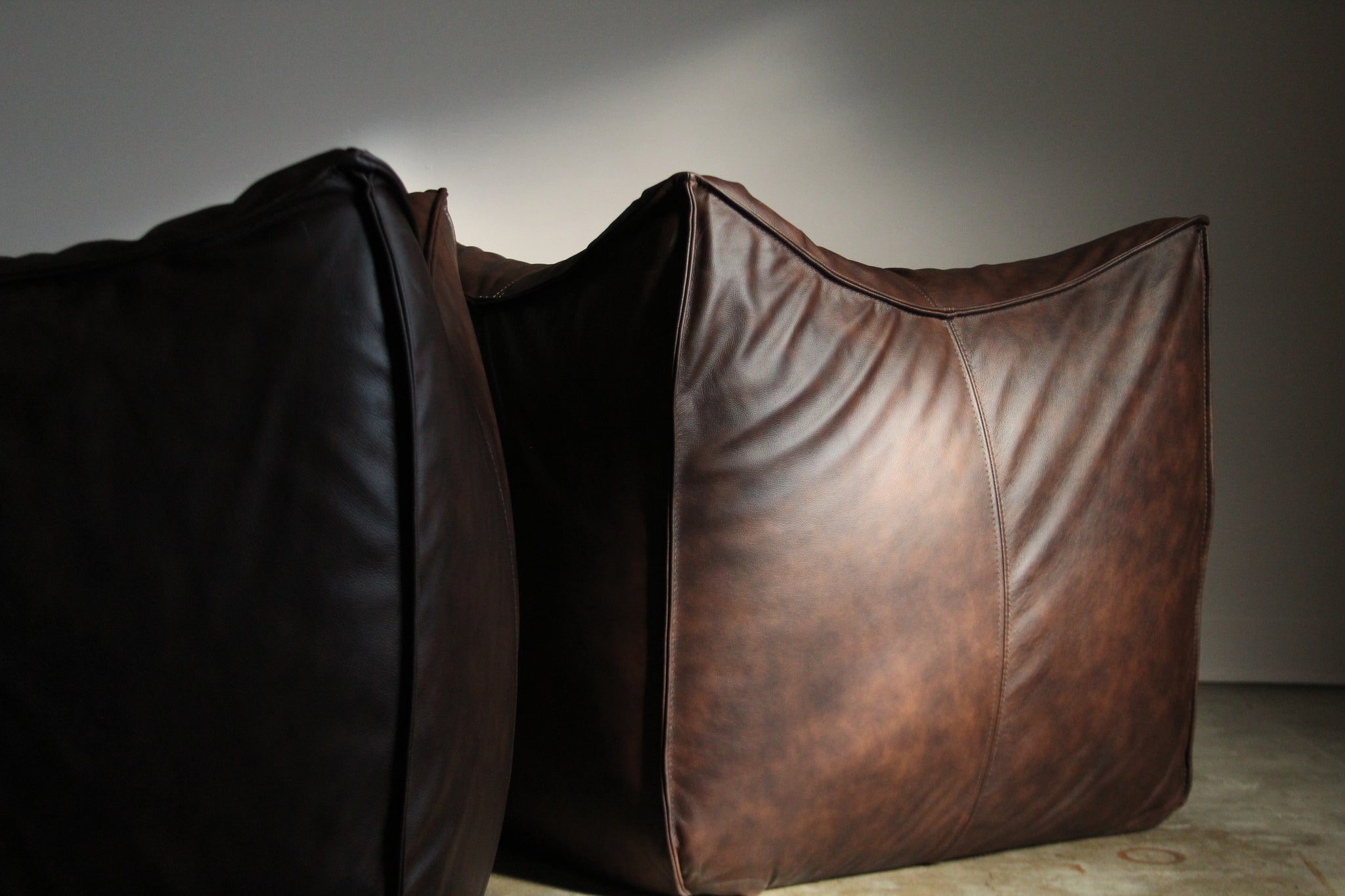A pair of 1st Generation "Bambole" corner lounge chairs, designed my Mario Bellini and manufactured by B&B Italia in the 1970s. These were purchased from the original owner. These chunky chairs have been wonderfully reupholstered in a chocolate brown leather and are ready to be broken in. They will continue to get more and more beautiful with time and use. The chairs can be pushed together to make a small loveseat as well. Leather is extremely soft, supple and cozy. Canvas on bottom.