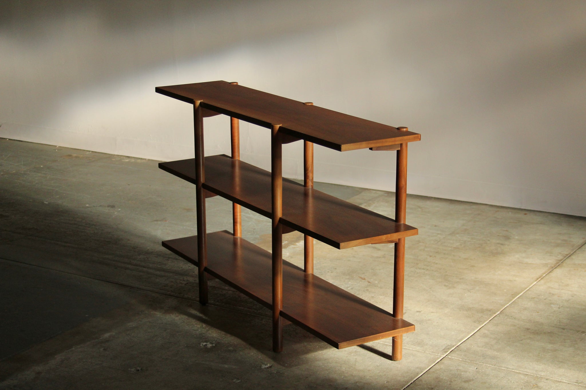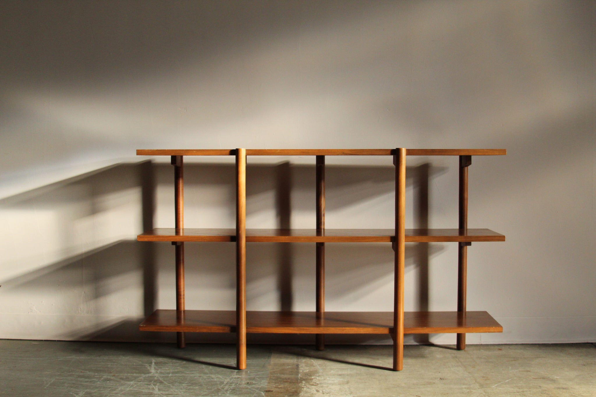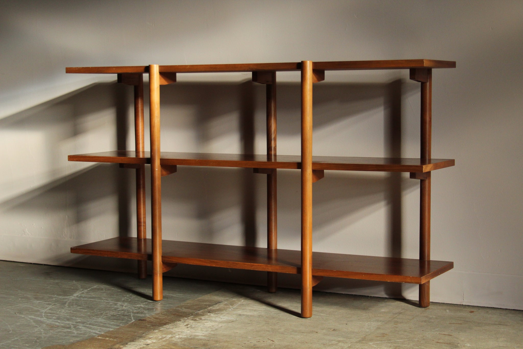 Milo Baughman walnut bookshelf manufactured by Glenn of California in 1955. This clever design features three shelves and five solid walnut legs supported by winged brackets. It is perfect for showcasing your plants, pottery, or books. It is finished on both sides so it may also be used like a small room divider. Lovely original condition with warm patina and some light age appropriate cosmetic wear. Solid and sturdy, ready for use.