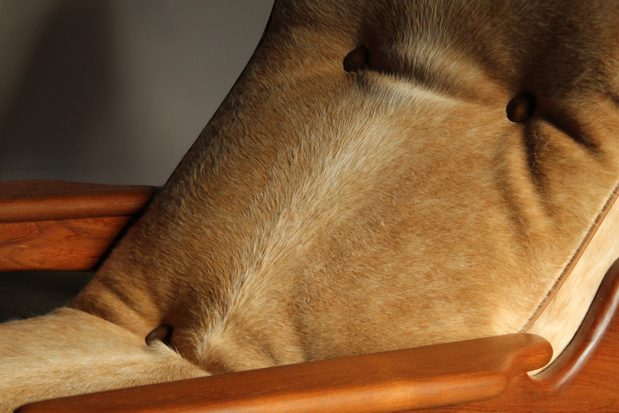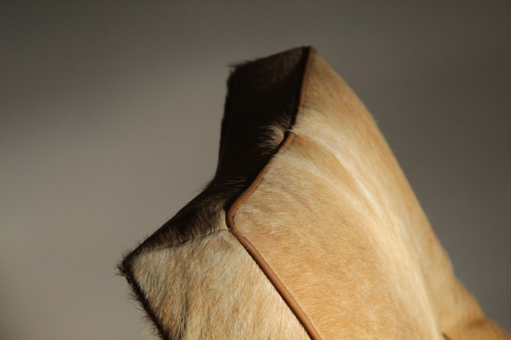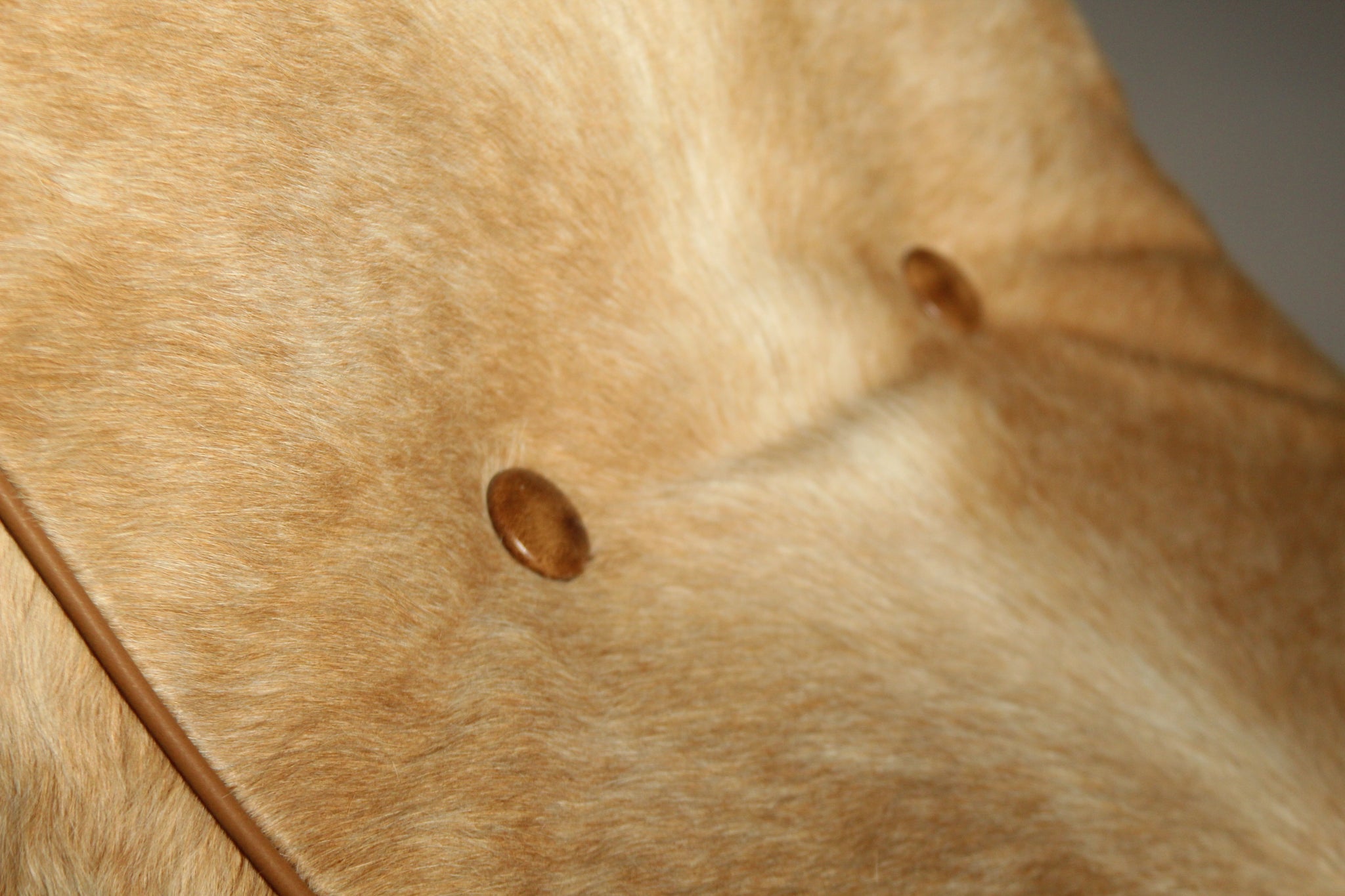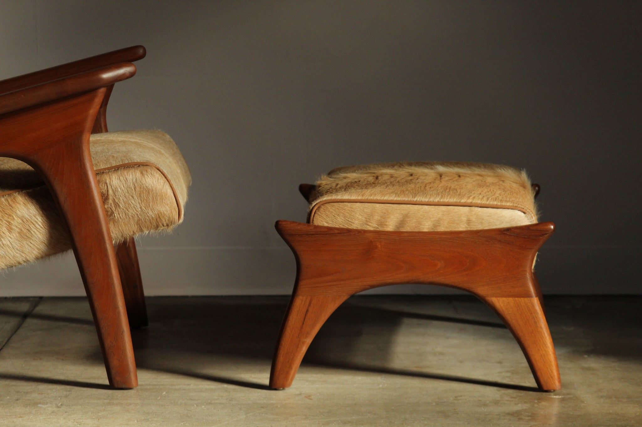 Adrian Pearsall for Craft Associates lounge chair 990-LC and matching ottoman. This large, dramatic, sculptural set features a walnut frame and beige cowhide upholstery with leather piping. A showstopper from every angle.