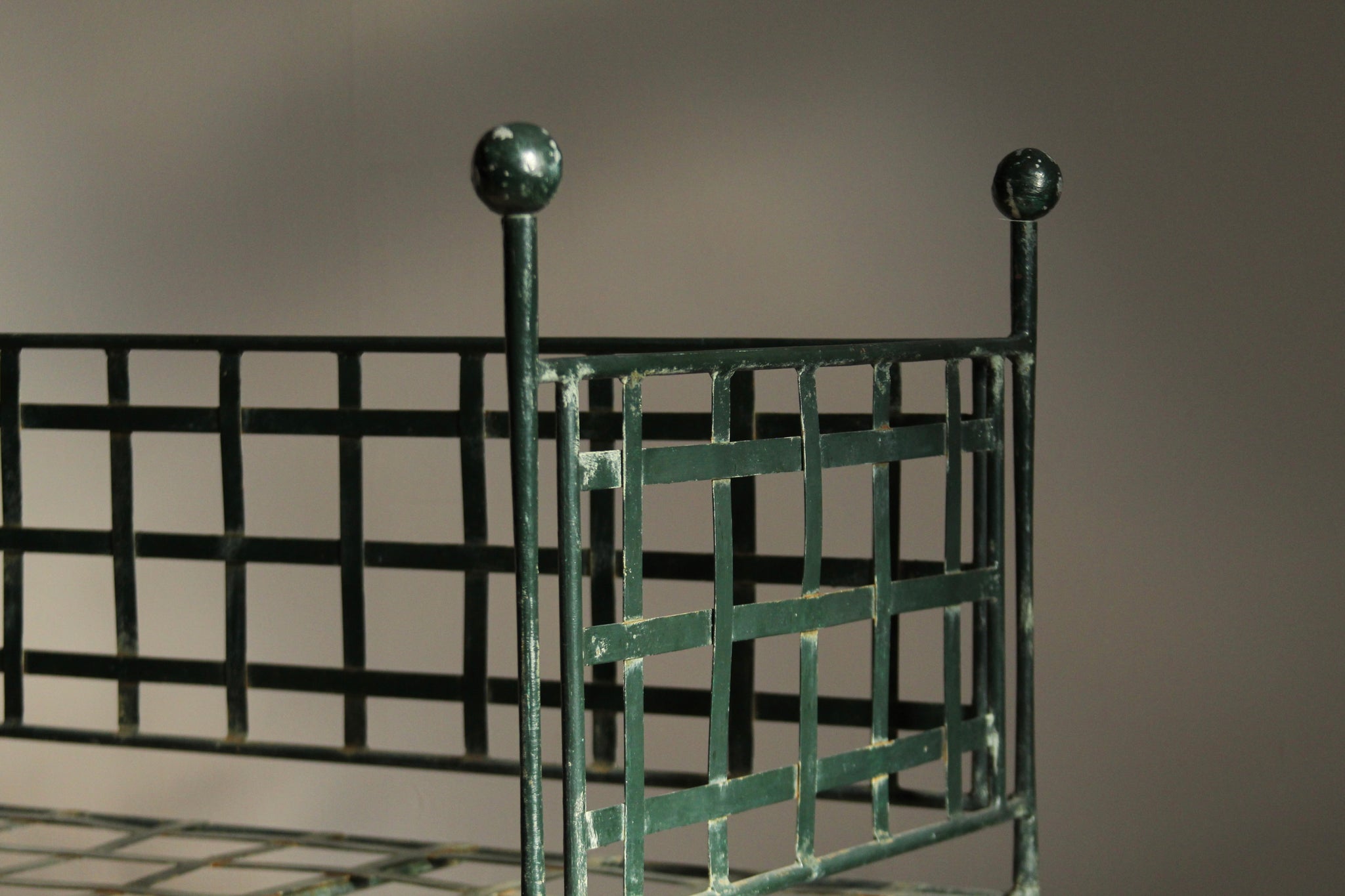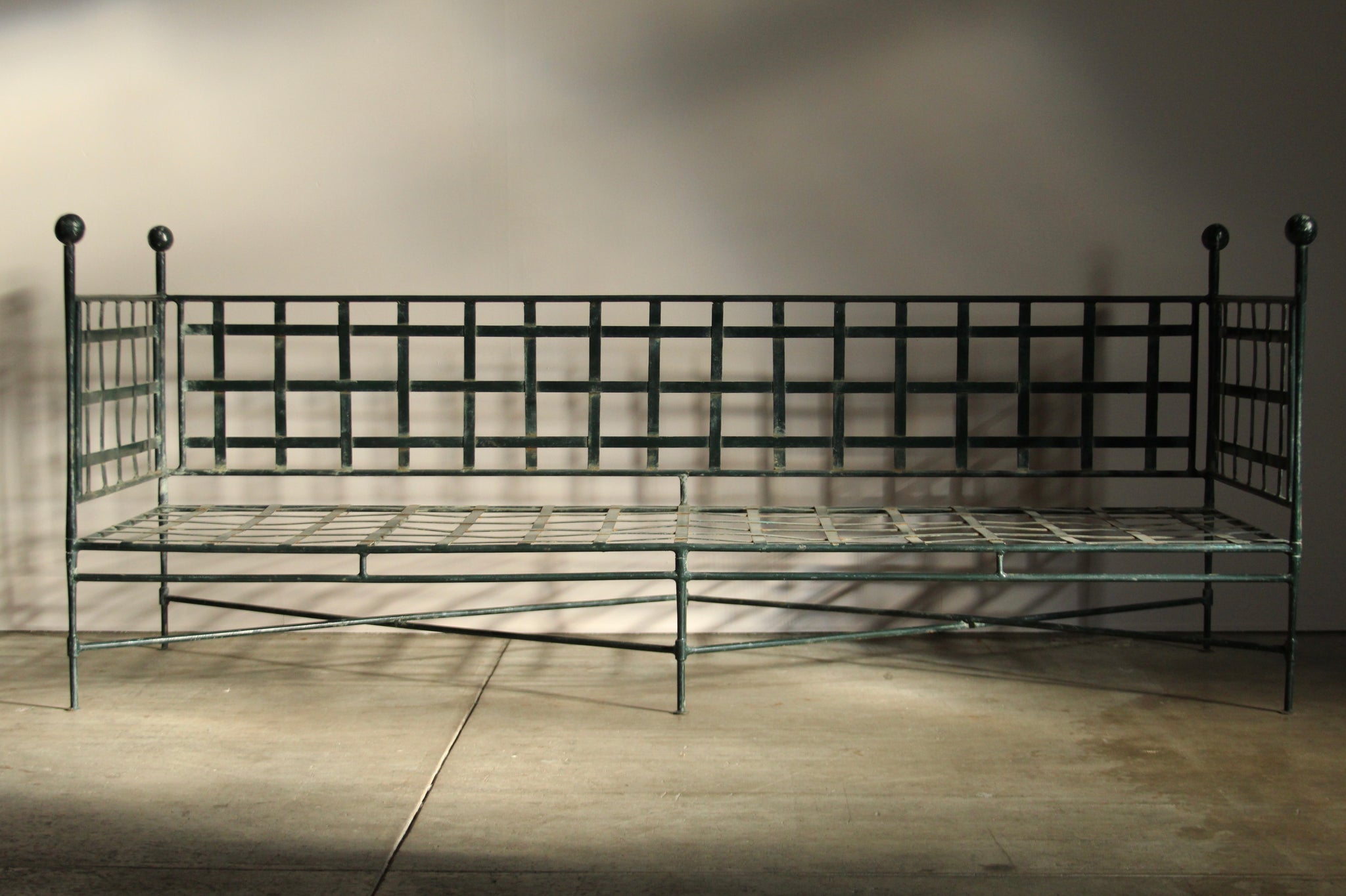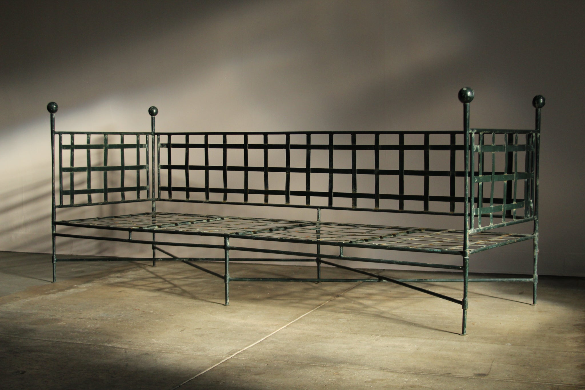 A beautiful outdoor "Amalfi" sofa designed by Mario Papperzini and manufactured by John Salterini in the 1960s. The sofa features wrought iron construction with hand tooled details, hand hammered ball finials, and woven lattice siding, seat and back. The construction is top tier, which is why these pieces are considered among the finest in outdoor and garden seating. The sofa retains the original forest green paint which makes this piece all the more special. The paint shows lots of imperfections, scratches, soft oxidation and patina, but that's what you want on one of these pieces, and it provides an absolutely striking, one-of-a-kind appeal. This design will never go out of style, and is ready for another 60 years of life.