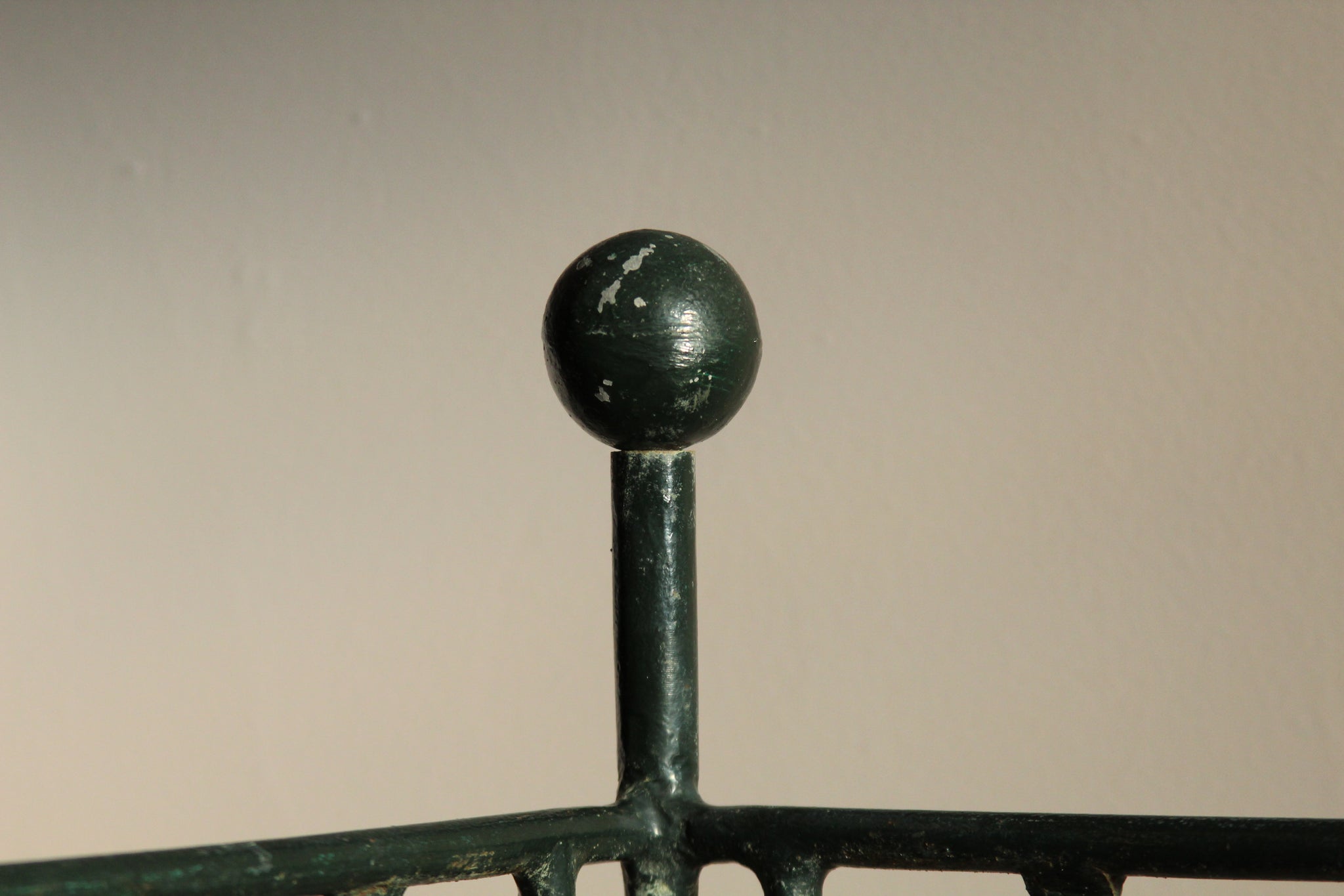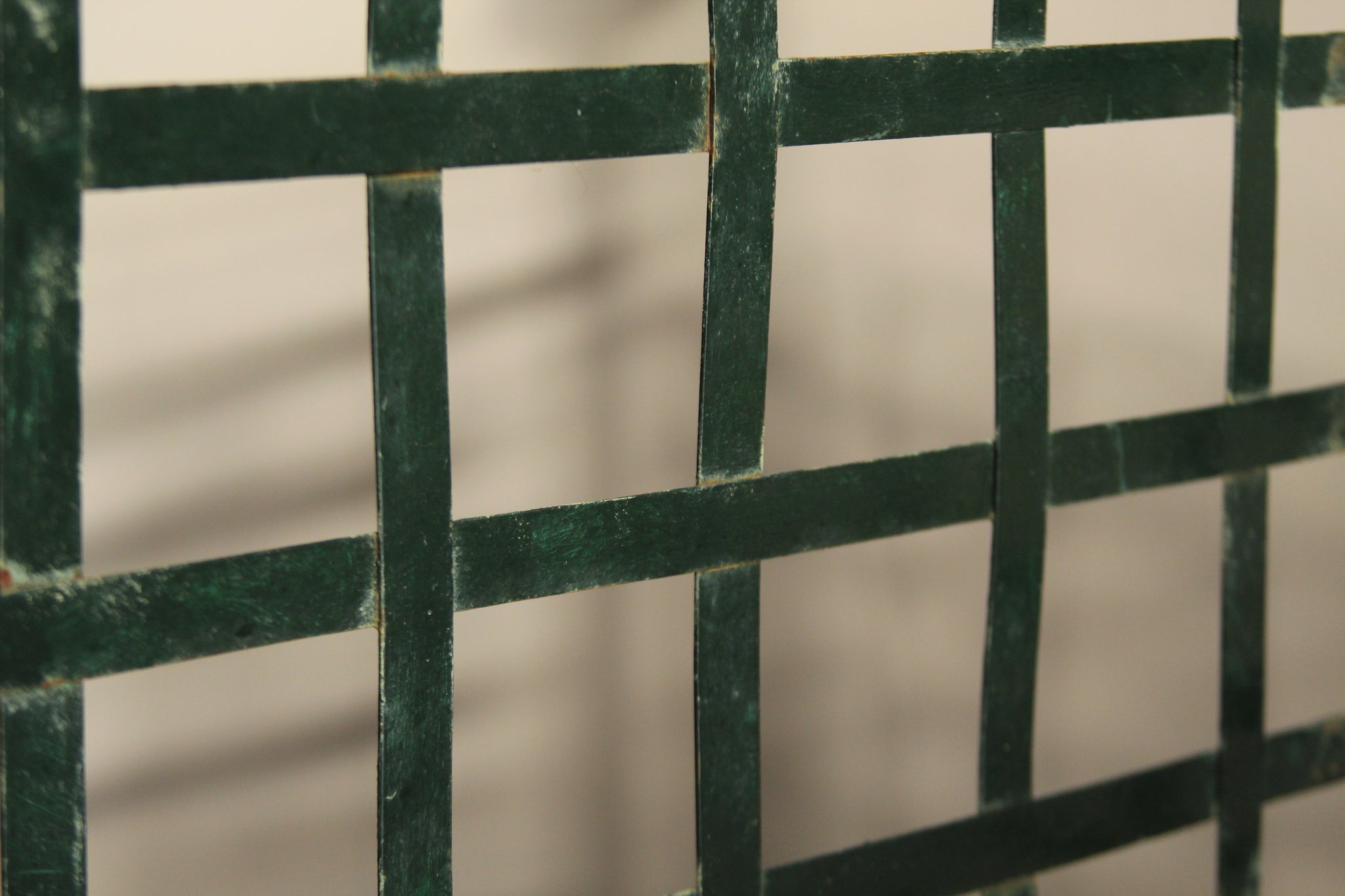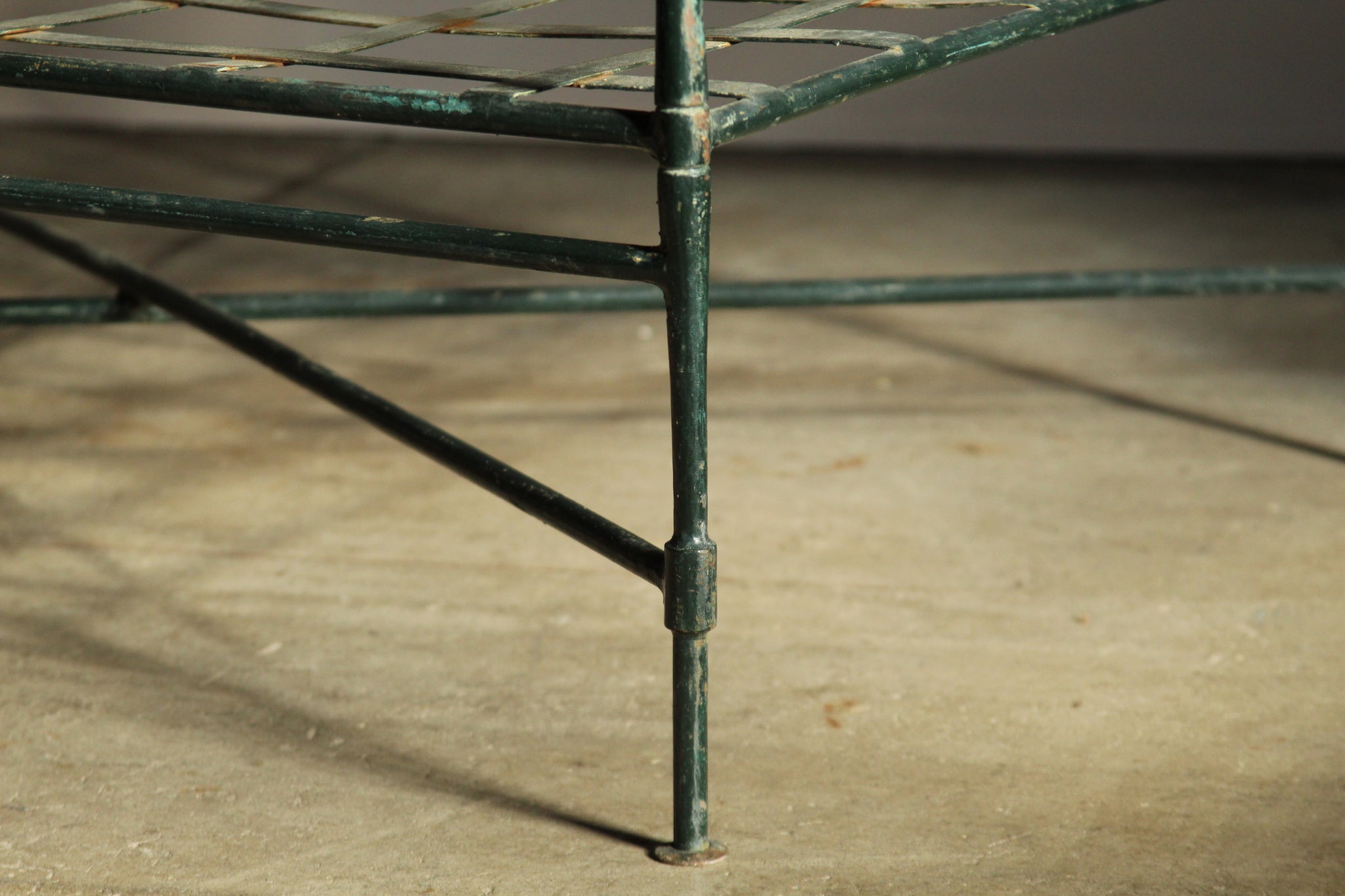 A beautiful outdoor "Amalfi" sofa designed by Mario Papperzini and manufactured by John Salterini in the 1960s. The sofa features wrought iron construction with hand tooled details, hand hammered ball finials, and woven lattice siding, seat and back. The construction is top tier, which is why these pieces are considered among the finest in outdoor and garden seating. The sofa retains the original forest green paint which makes this piece all the more special. The paint shows lots of imperfections, scratches, soft oxidation and patina, but that's what you want on one of these pieces, and it provides an absolutely striking, one-of-a-kind appeal. This design will never go out of style, and is ready for another 60 years of life.