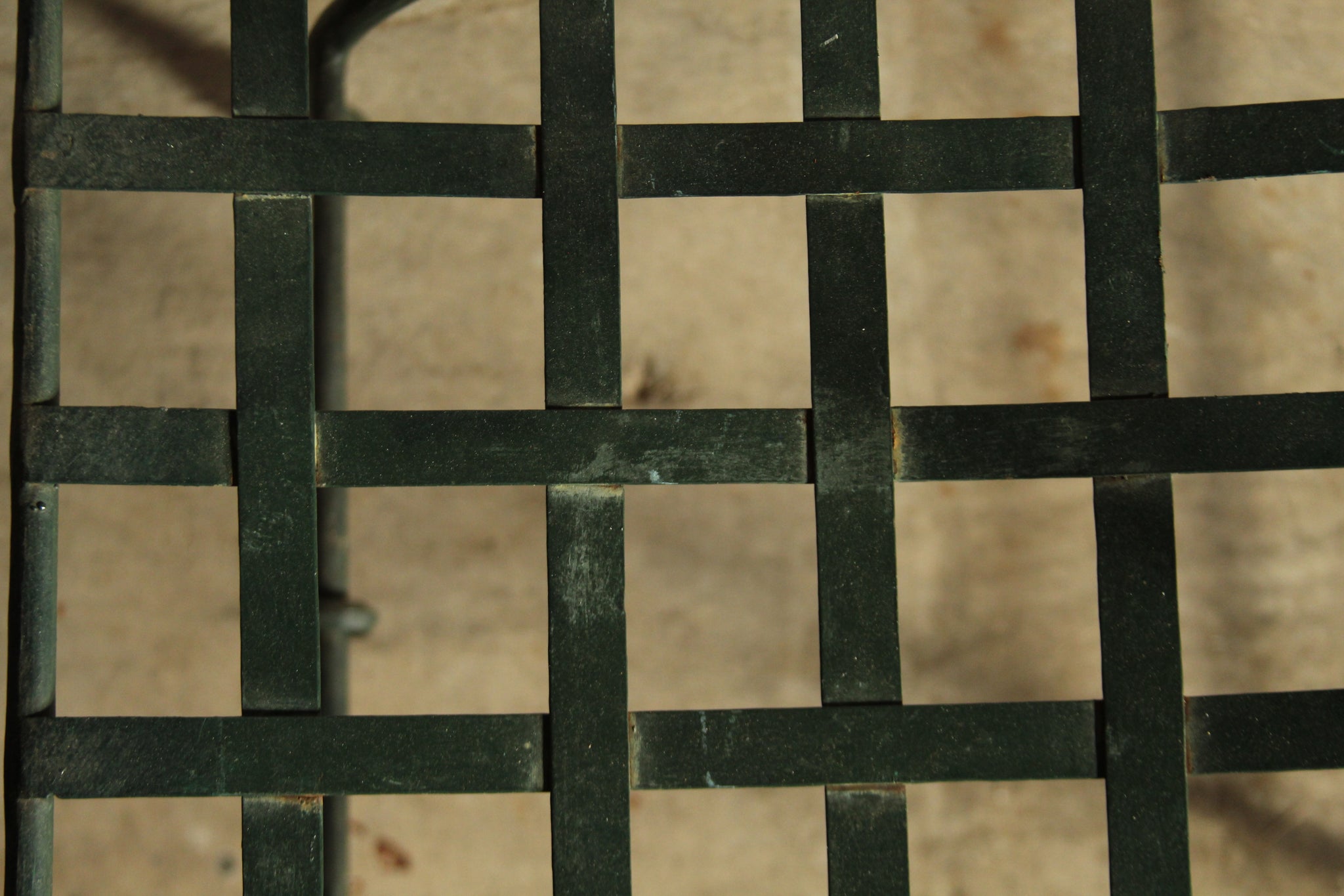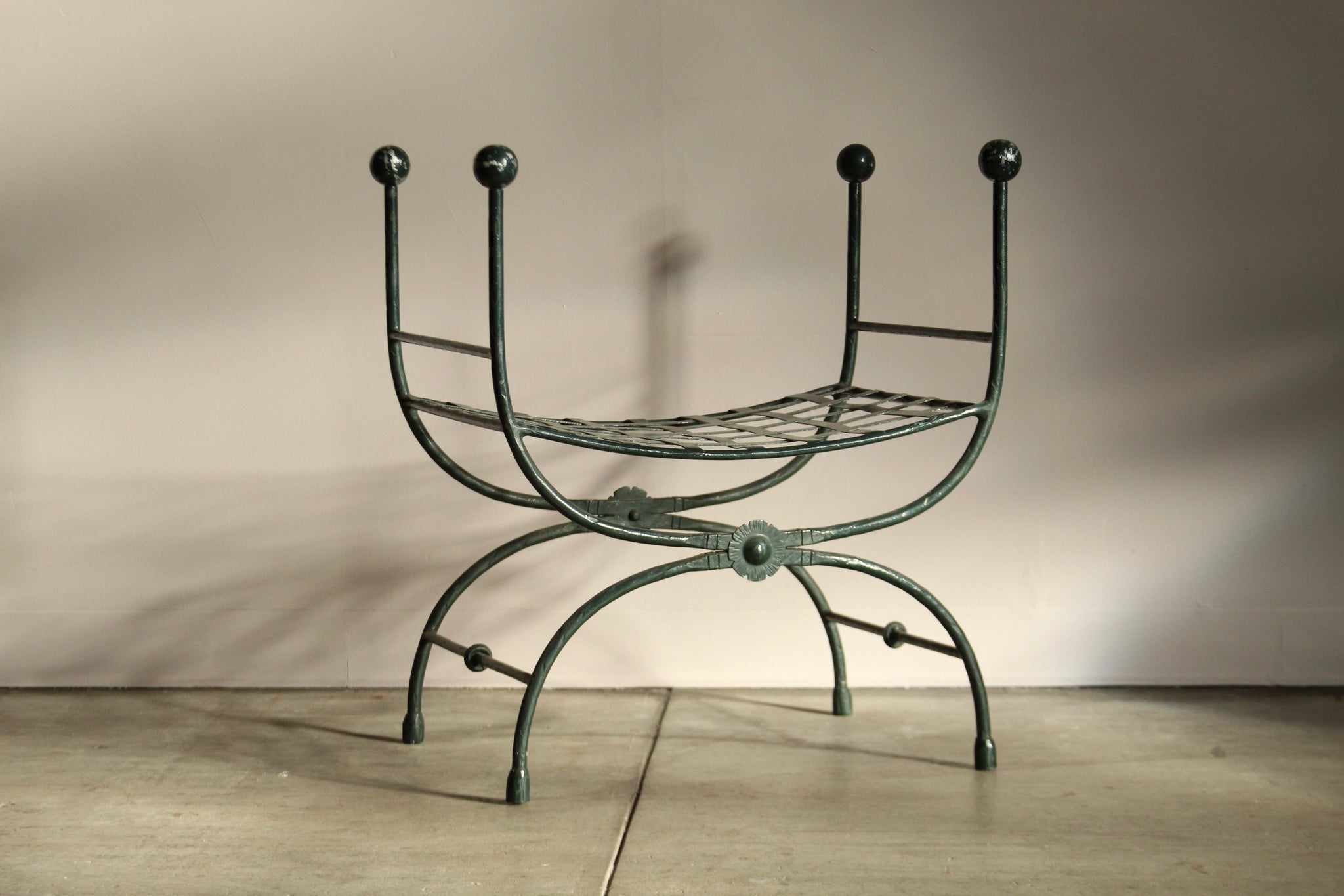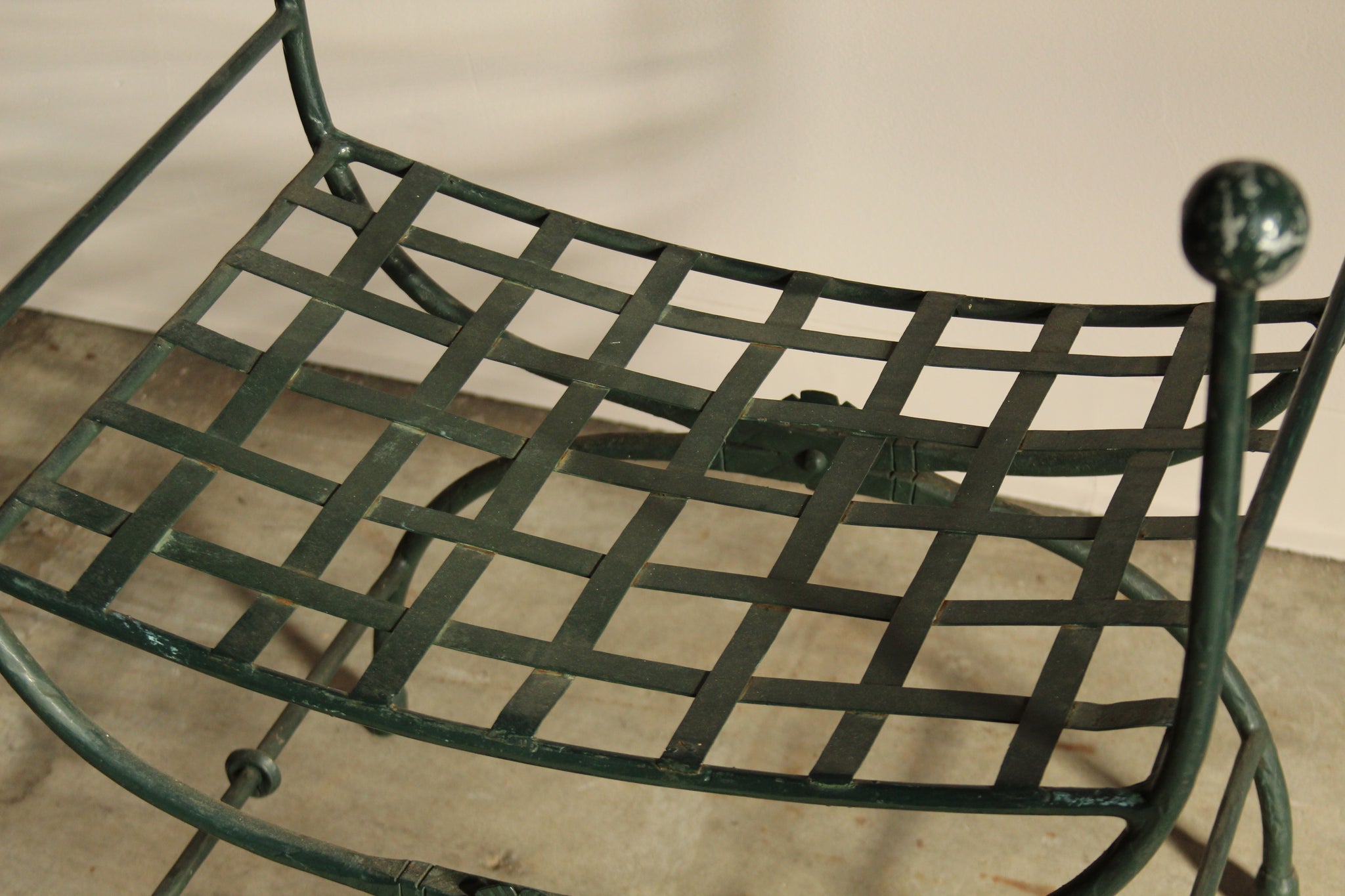 A beautiful outdoor "Amalfi" stool designed by Mario Papperzini and manufactured by John Salterini in the 1960s. This rare stool features wrought iron construction with hand tooled details, hand hammered ball finials, and woven lattice seat. The construction is top tier, which is why these pieces are considered among the finest in outdoor and garden seating. The stool retains the original forest green paint which makes this piece all the more special. The paint shows lots of imperfections, scratches, soft oxidation and patina, but that's what you want on one of these pieces, and it provides an absolutely striking, one-of-a-kind appeal. This design will never go out of style, and is ready for another 60 years of life.