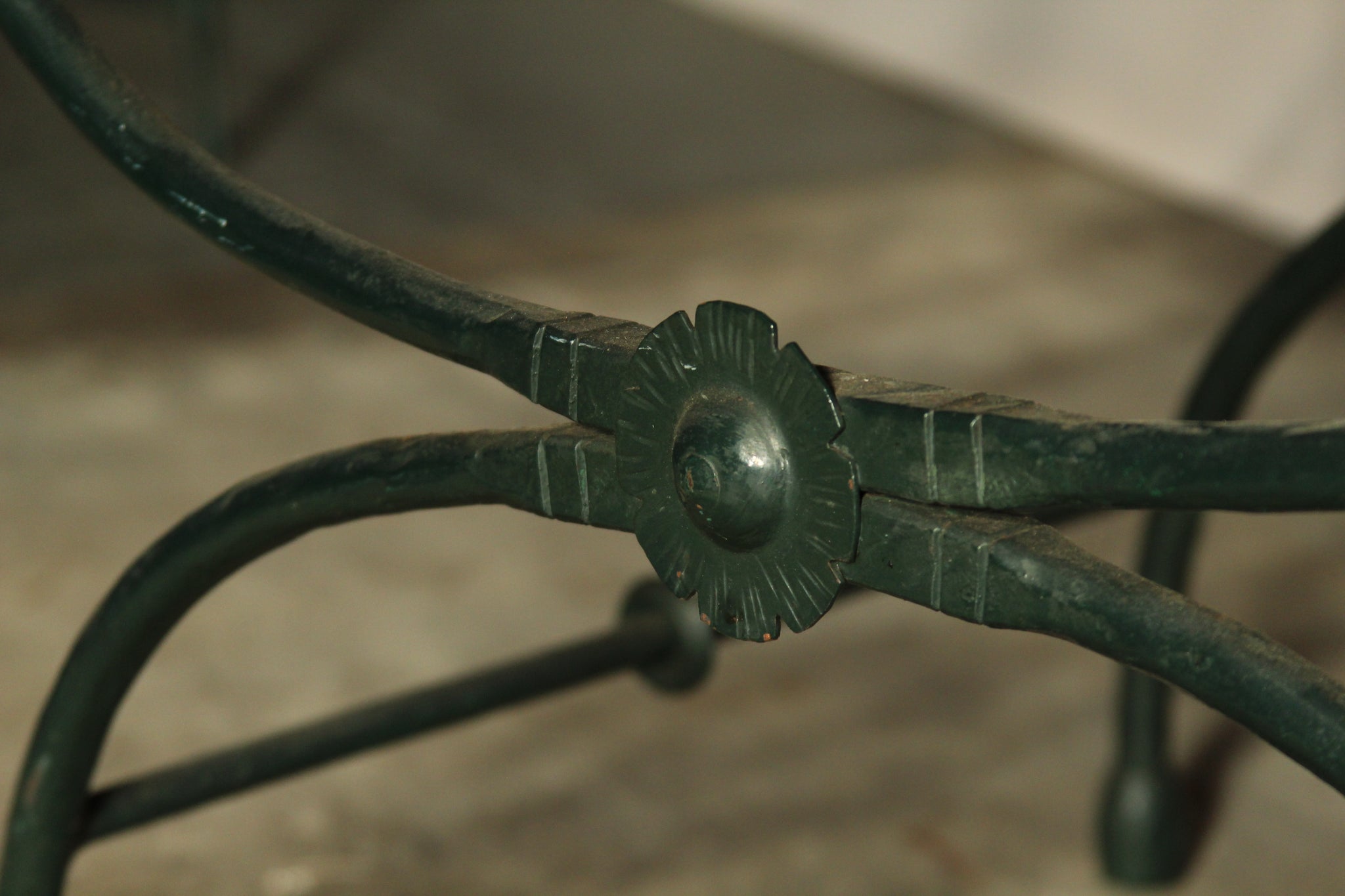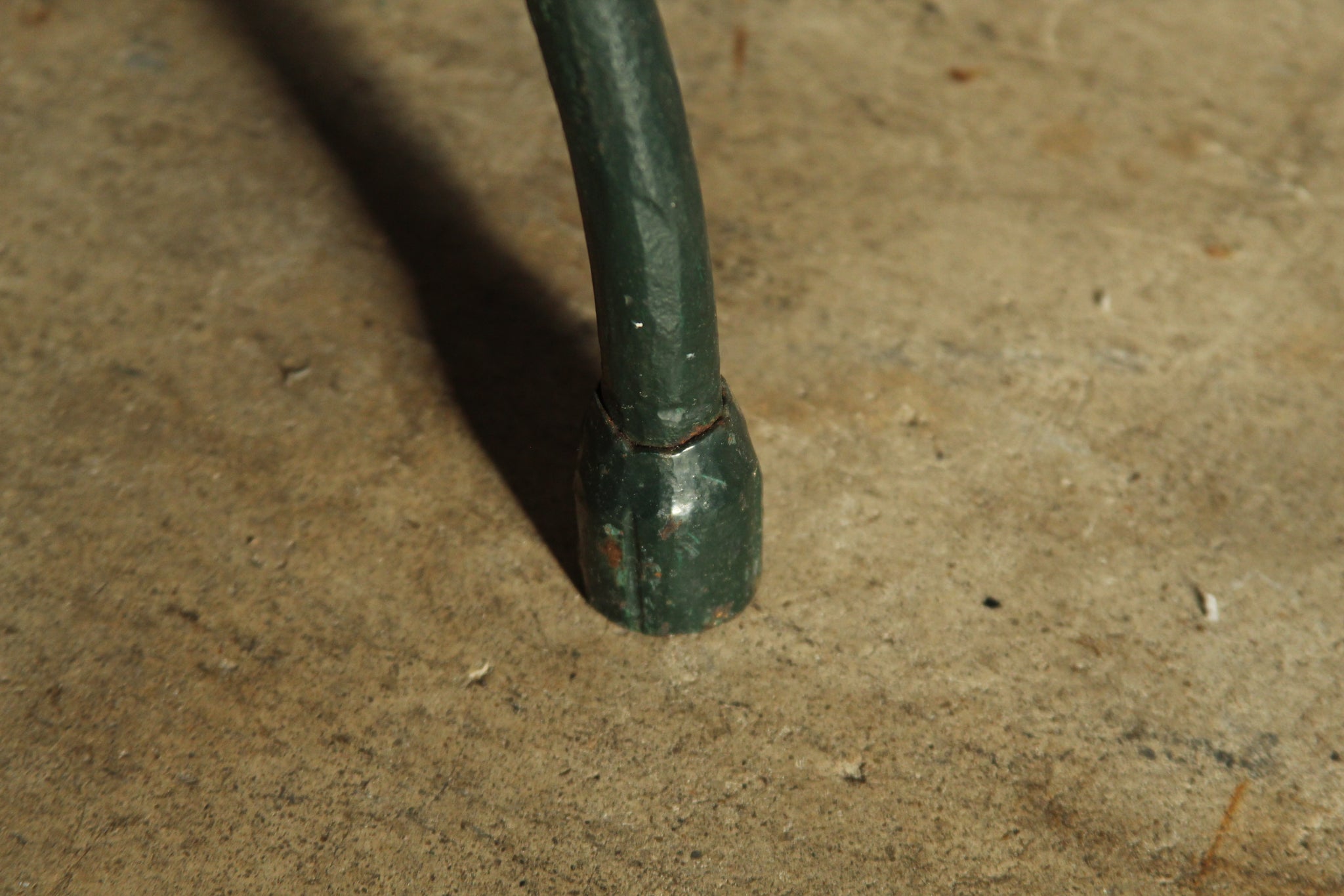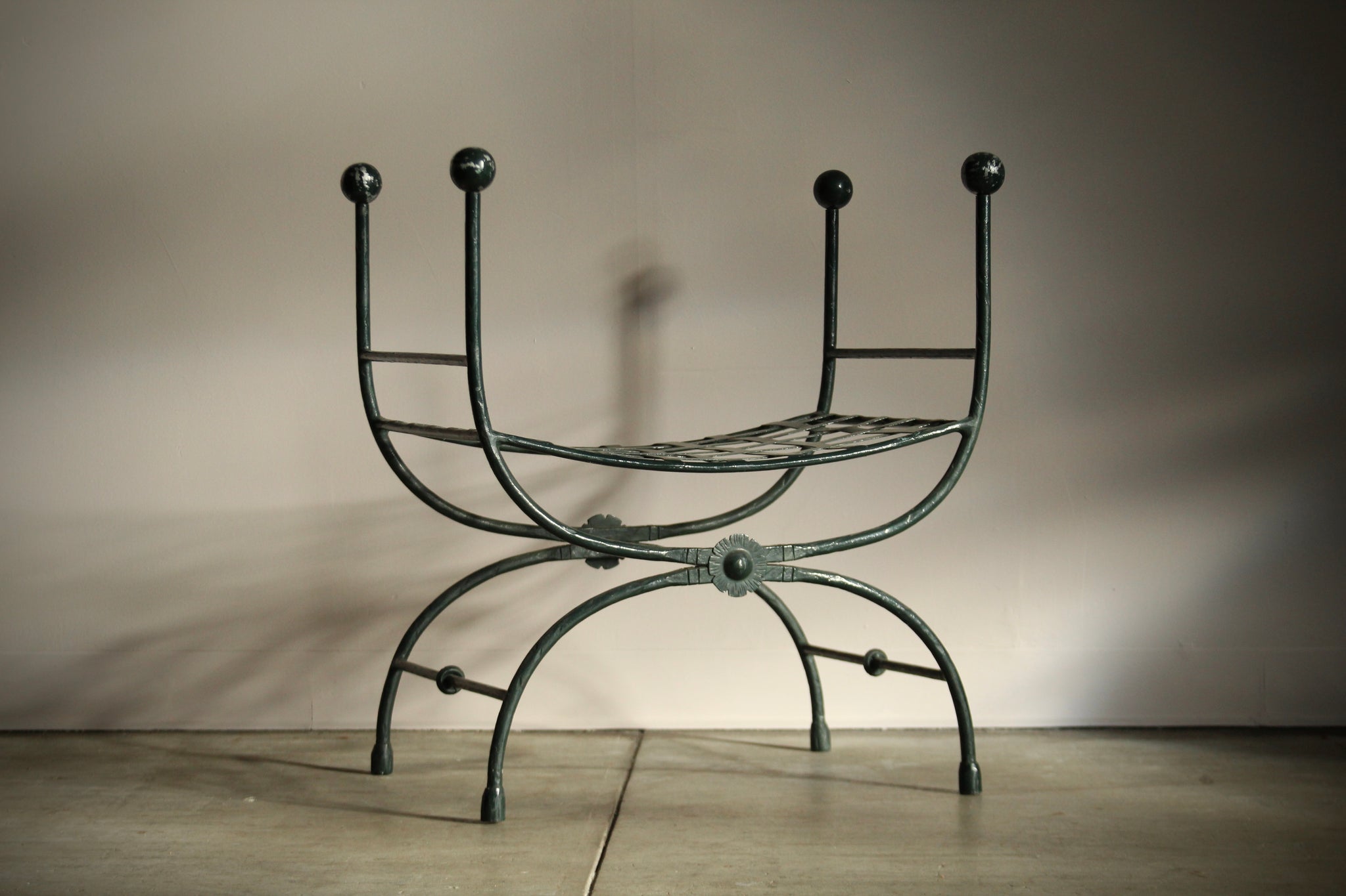 A beautiful outdoor "Amalfi" stool designed by Mario Papperzini and manufactured by John Salterini in the 1960s. This rare stool features wrought iron construction with hand tooled details, hand hammered ball finials, and woven lattice seat. The construction is top tier, which is why these pieces are considered among the finest in outdoor and garden seating. The stool retains the original forest green paint which makes this piece all the more special. The paint shows lots of imperfections, scratches, soft oxidation and patina, but that's what you want on one of these pieces, and it provides an absolutely striking, one-of-a-kind appeal. This design will never go out of style, and is ready for another 60 years of life.
