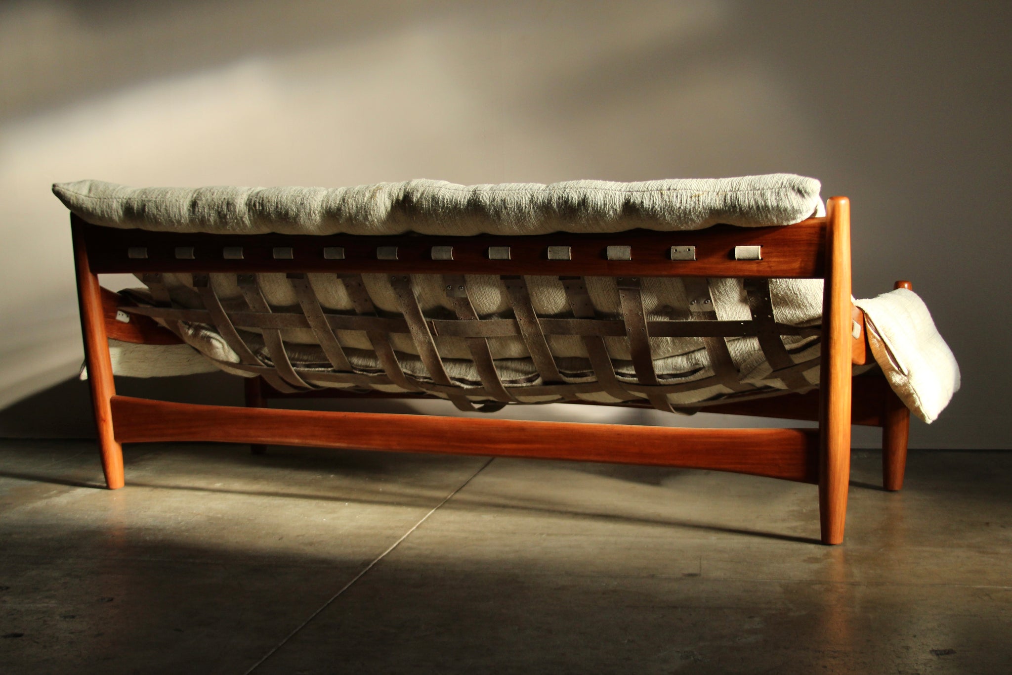 This stunning "Sheriff" sofa was designed by the renowned Brazilian designer Sergio Rodrigues in the 1950s. This example was manufactured in Italy in the 1960s when it was licensed to ISA Bergamo. The sofa embodies an uncommon combination of sexy, sophisticated aesthetic and tremendous comfort, featuring a solid Imbuia wood frame, original leather straps, and vintage, nubby Haitian cotton fabric with feather down inserts. The cushions are designed to hand off each edge of the sofa, creating a soft, laid back, organic form.