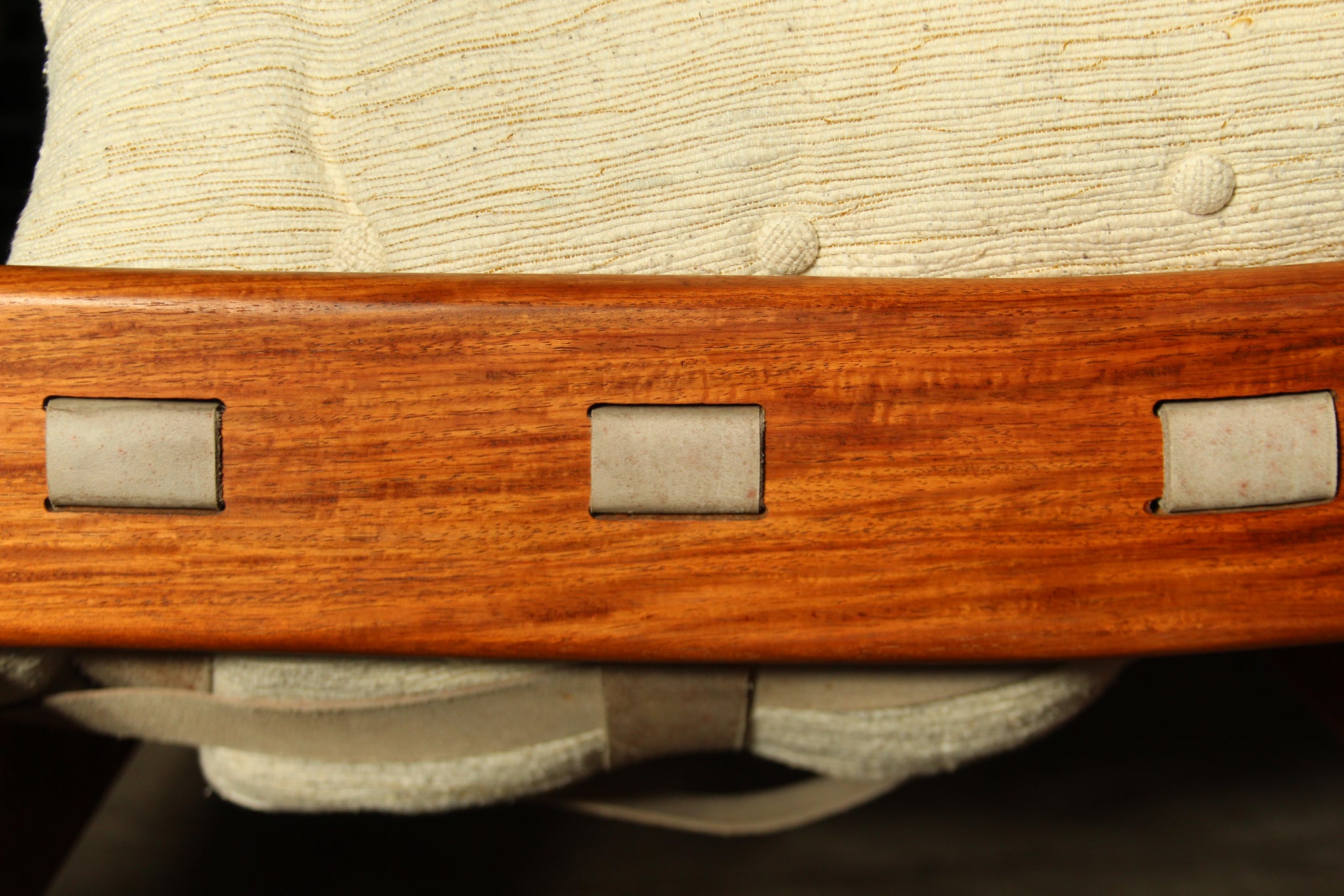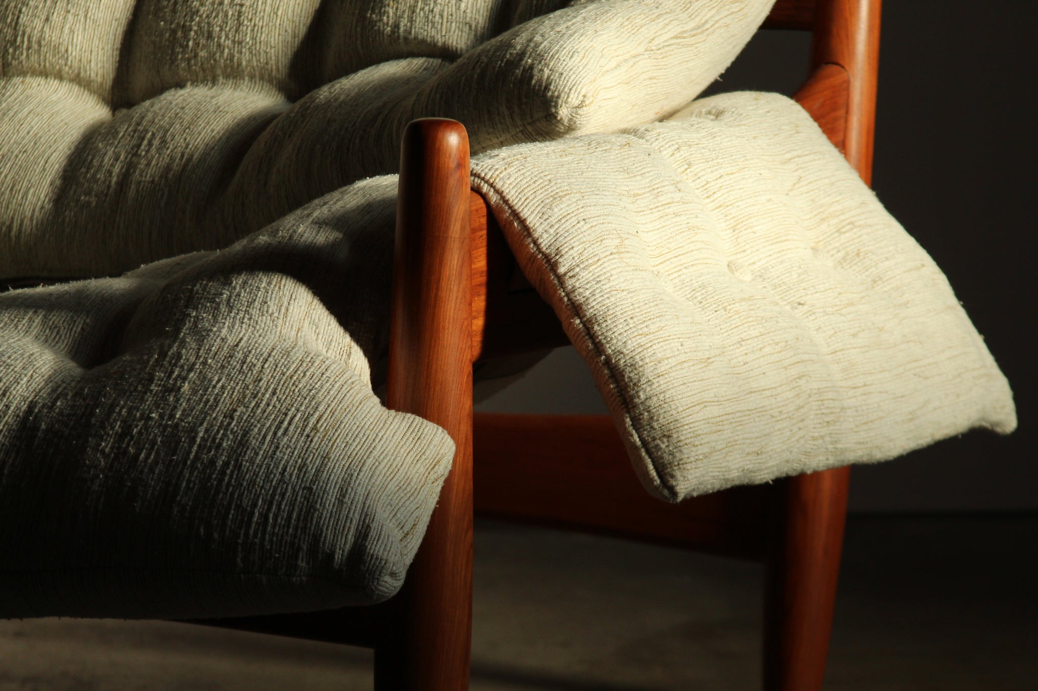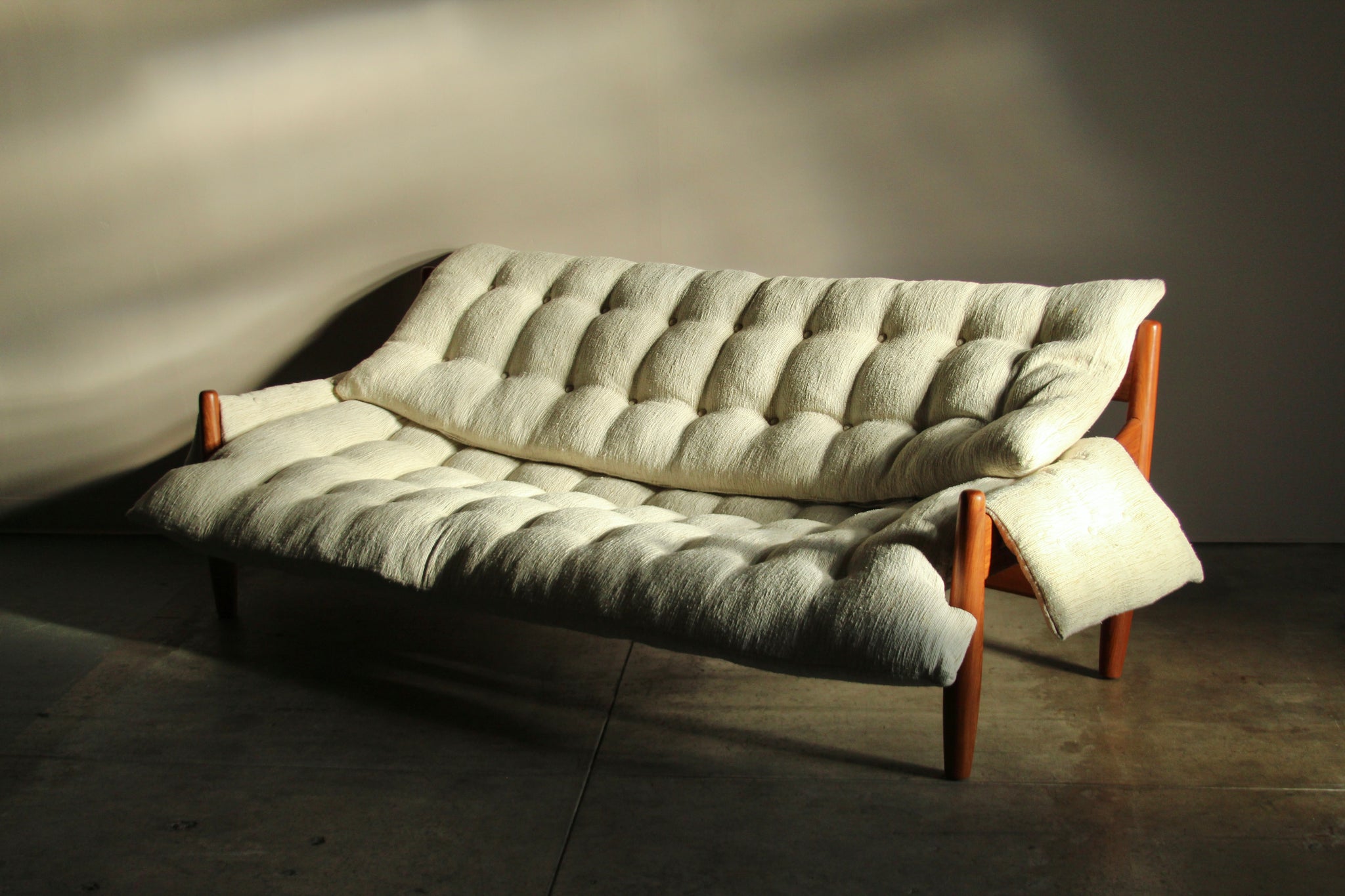 The sofa has been lovingly restored: the frame has been refinished and is in lovely vintage condition. All the cushions have been brought back to life with new feather down inserts, and each of the large cushions has been re-tufted by hand. Excellent vintage condition overall, ready for another 50 years of cozy lounging.