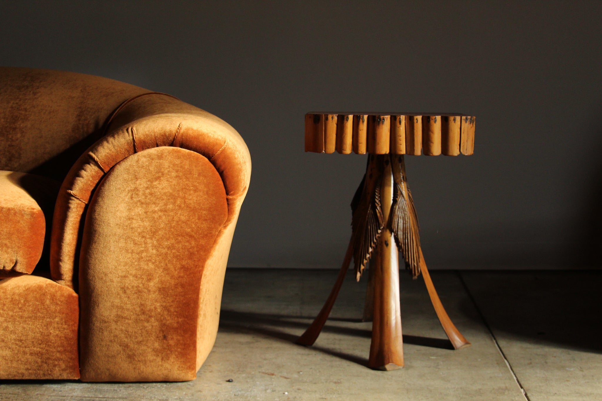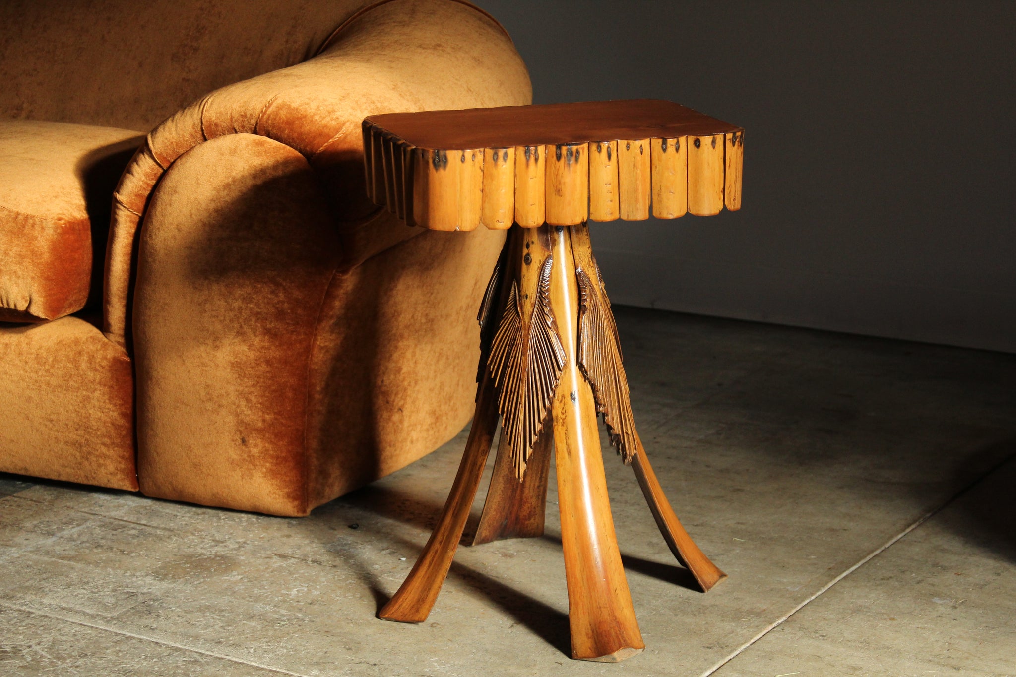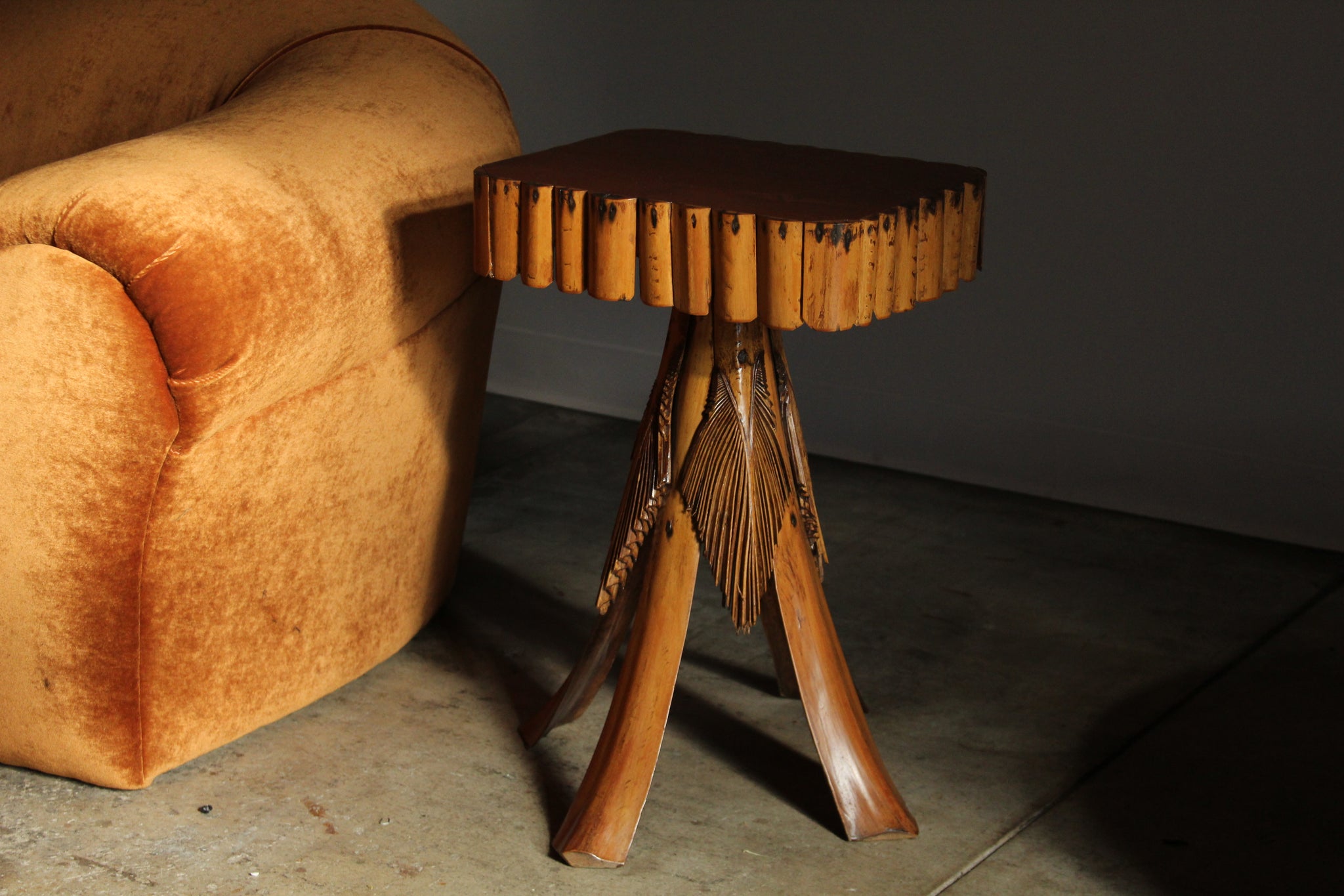 A striking and exceptionally unique 1930s Tramp Art palm frond accent table or pedestal. The table consists of four large palm frond legs and a rectangular top adorned in a decorative palm apron. The table has been gently restored and is in excellent vintage condition, solid and sturdy, and shows tons of warm, glowing patina throughout. Use as an accent table, put a bouquet of flowers on it, or showcase your favorite sculpture. Something totally different!