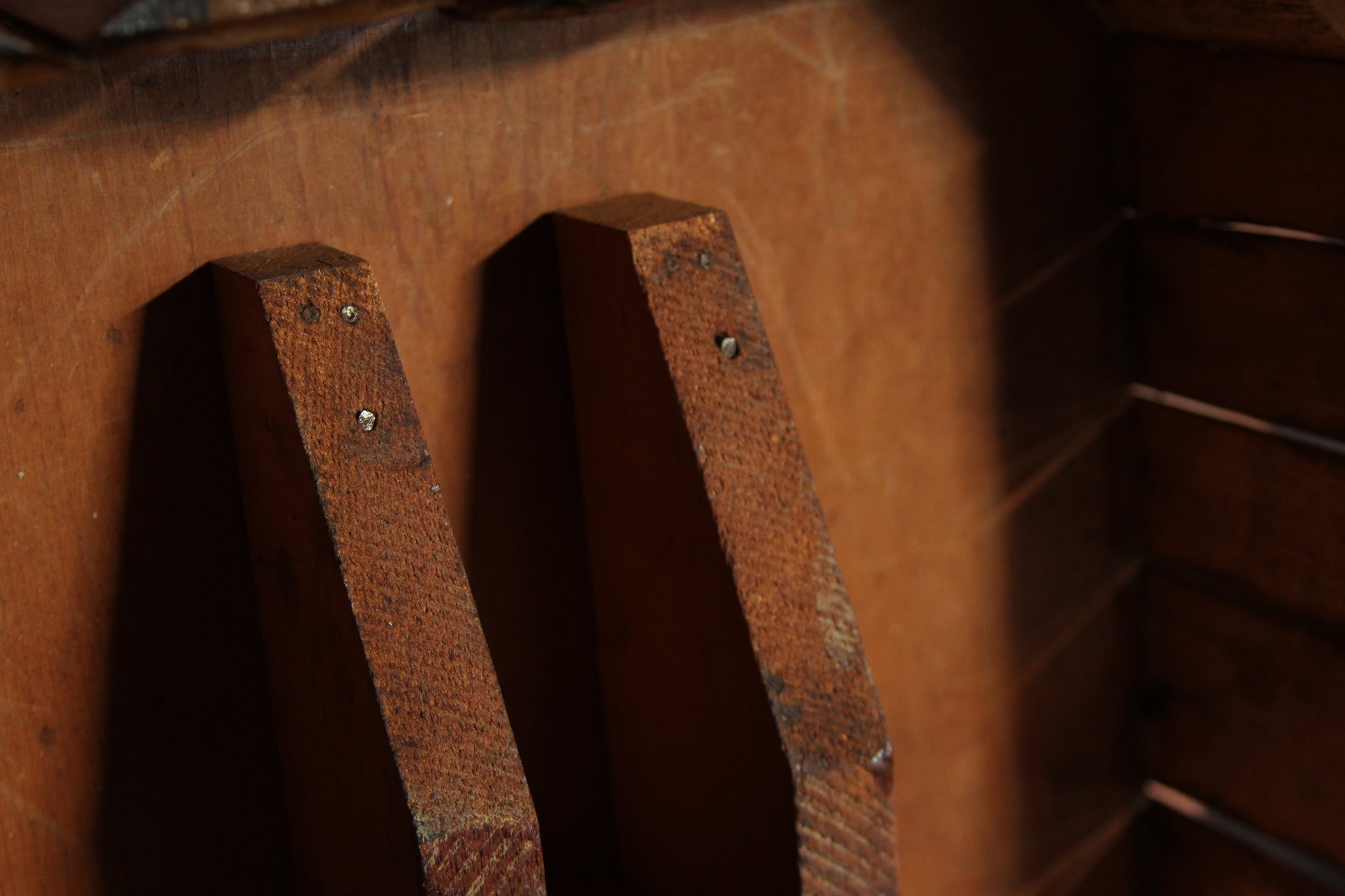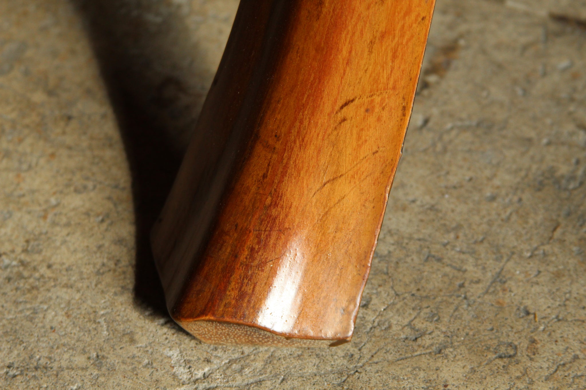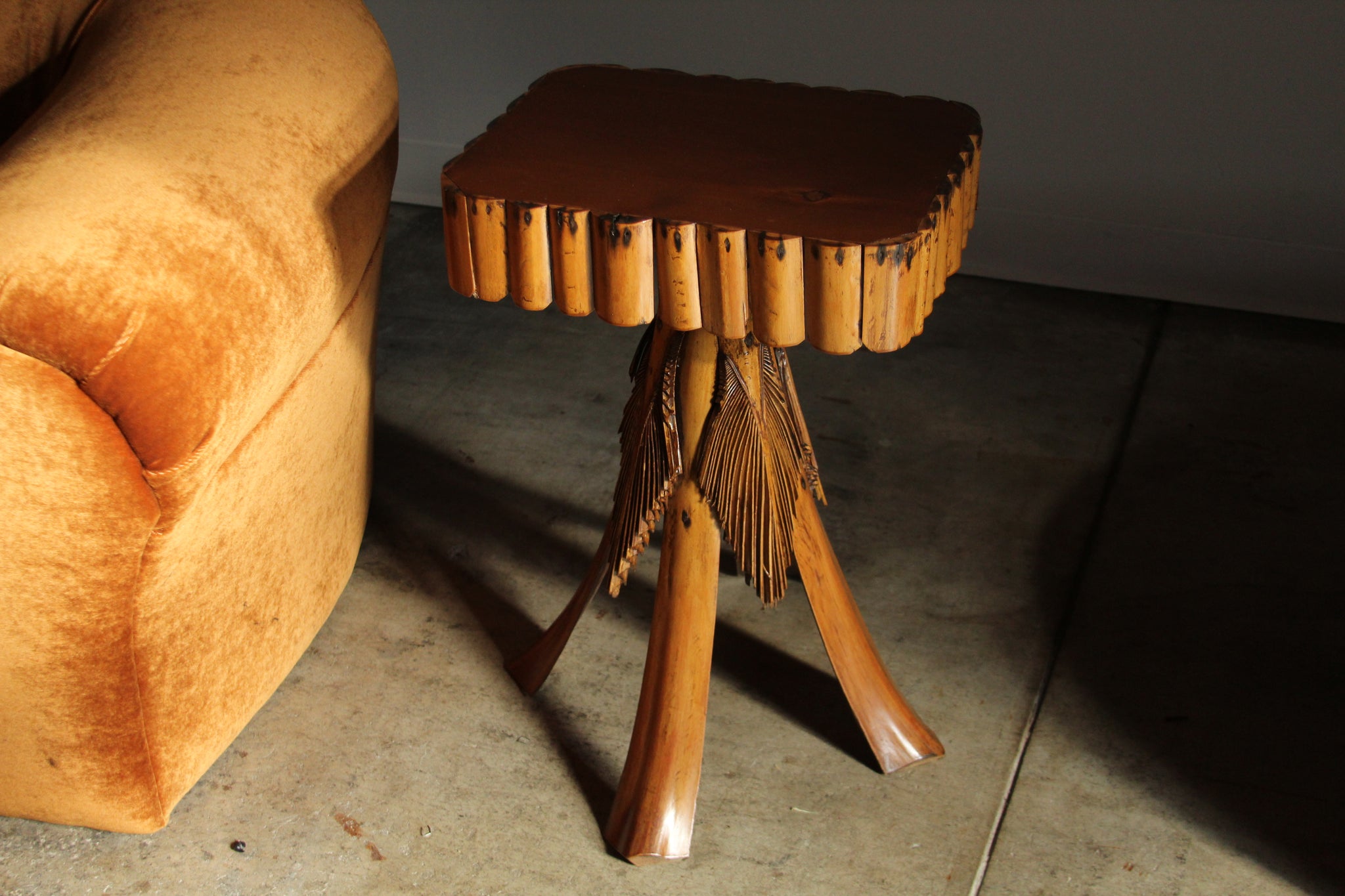 A striking and exceptionally unique 1930s Tramp Art palm frond accent table or pedestal. The table consists of four large palm frond legs and a rectangular top adorned in a decorative palm apron. The table has been gently restored and is in excellent vintage condition, solid and sturdy, and shows tons of warm, glowing patina throughout. Use as an accent table, put a bouquet of flowers on it, or showcase your favorite sculpture. Something totally different!